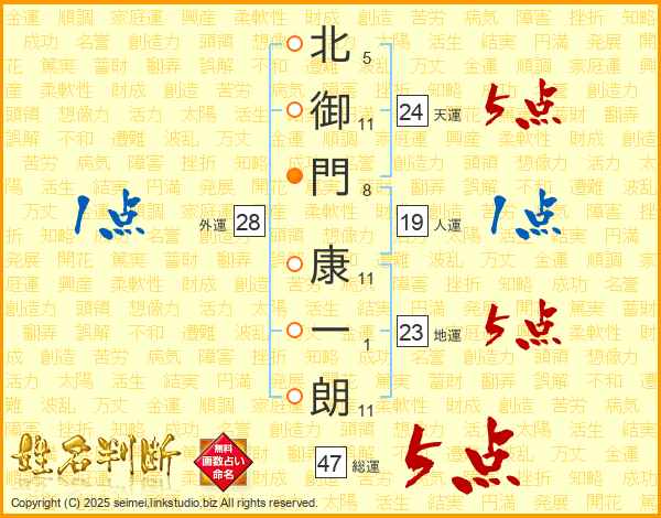 北(5画)御(11画)門(8画) 康(11画)一(1画)朗(11画)