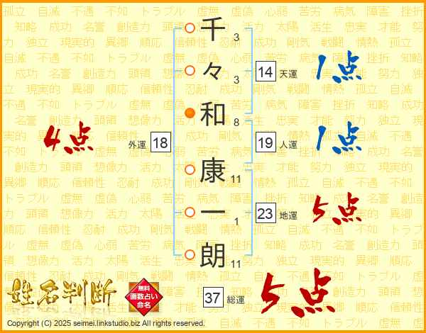 千(3画)々(3画)和(8画) 康(11画)一(1画)朗(11画)