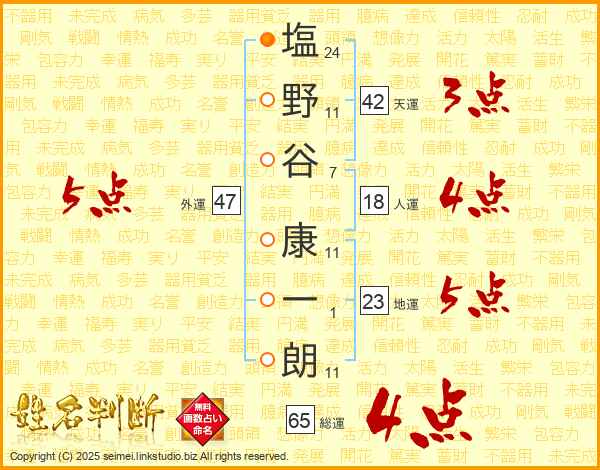 塩野谷康一朗さんの総運は65画の4点!