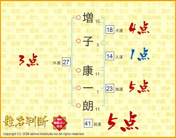 増(15画)子(3画) 康(11画)一(1画)朗(11画)
