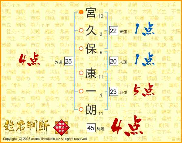 宮(10画)久(3画)保(9画) 康(11画)一(1画)朗(11画)