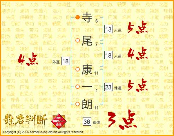 寺(6画)尾(7画) 康(11画)一(1画)朗(11画)