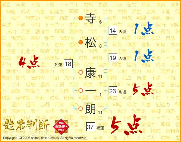 寺(6画)松(8画) 康(11画)一(1画)朗(11画)