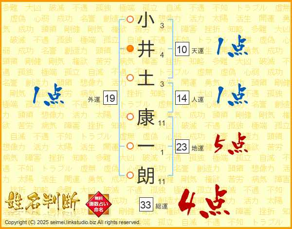 小(3画)井(4画)土(3画) 康(11画)一(1画)朗(11画)