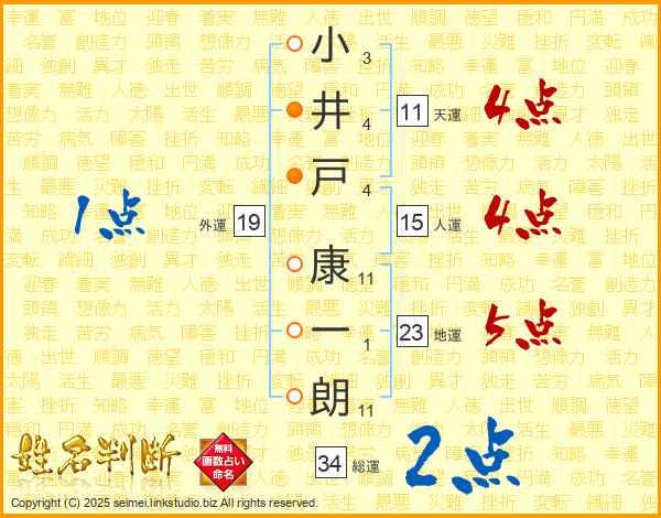小(3画)井(4画)戸(4画) 康(11画)一(1画)朗(11画)