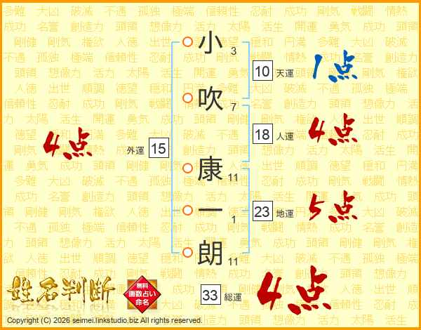 小(3画)吹(7画) 康(11画)一(1画)朗(11画)