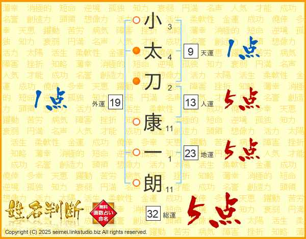 小(3画)太(4画)刀(2画) 康(11画)一(1画)朗(11画)