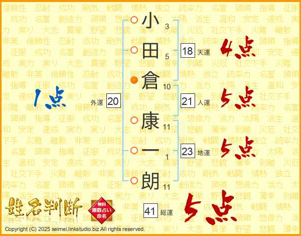 小田倉康一朗さんの総運は41画の5点!