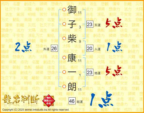 御(11画)子(3画)柴(9画) 康(11画)一(1画)朗(11画)
