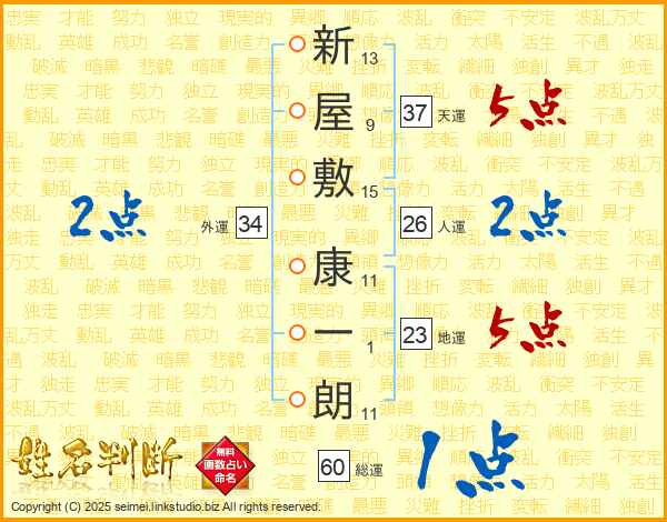 新(13画)屋(9画)敷(15画) 康(11画)一(1画)朗(11画)