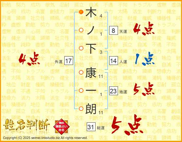 木(4画)ノ(1画)下(3画) 康(11画)一(1画)朗(11画)