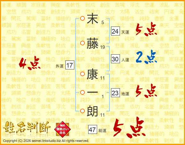 末(5画)藤(19画) 康(11画)一(1画)朗(11画)