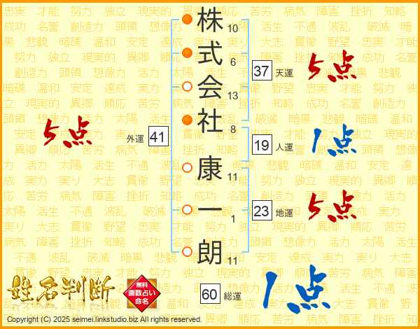 株(10画)式(6画)会(13画)社(8画) 康(11画)一(1画)朗(11画)