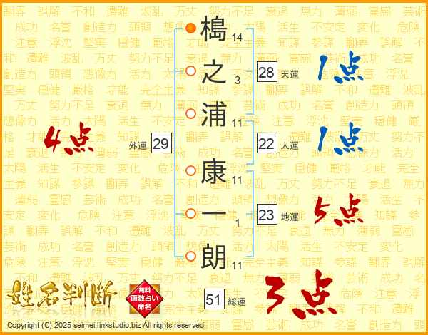 槝(14画)之(3画)浦(11画) 康(11画)一(1画)朗(11画)