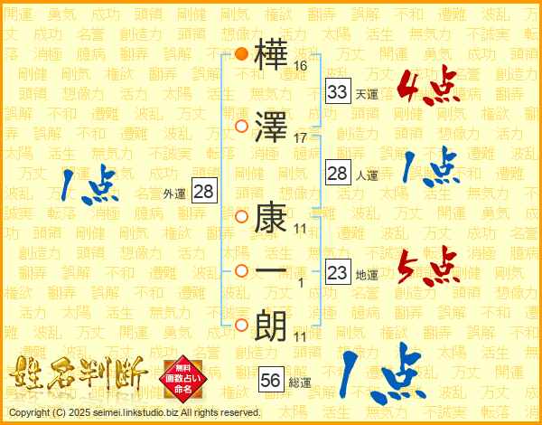 樺(16画)澤(17画) 康(11画)一(1画)朗(11画)