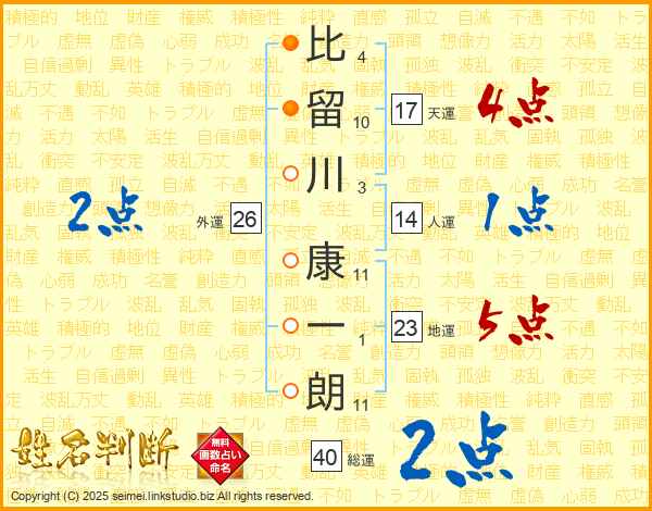 比(4画)留(10画)川(3画) 康(11画)一(1画)朗(11画)