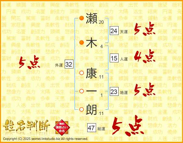 瀬(20画)木(4画) 康(11画)一(1画)朗(11画)