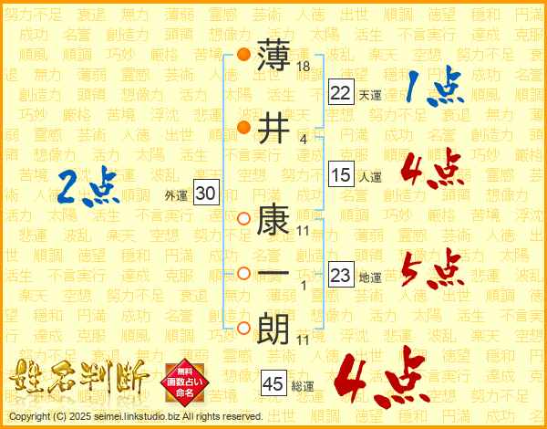 薄井康一朗さんの総運は45画の4点!