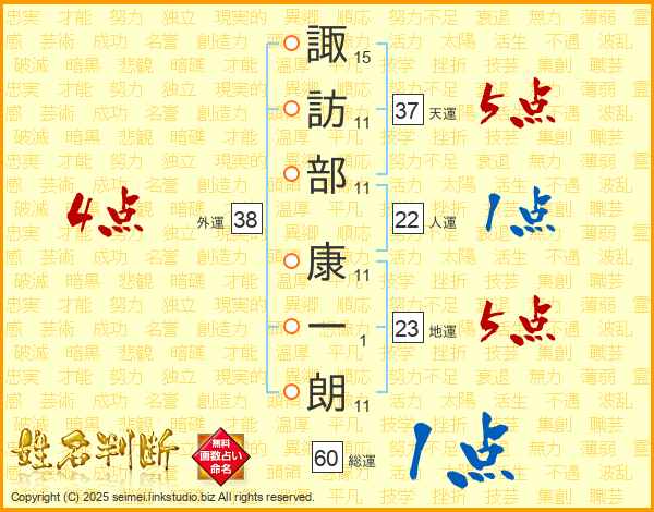 諏(15画)訪(11画)部(11画) 康(11画)一(1画)朗(11画)