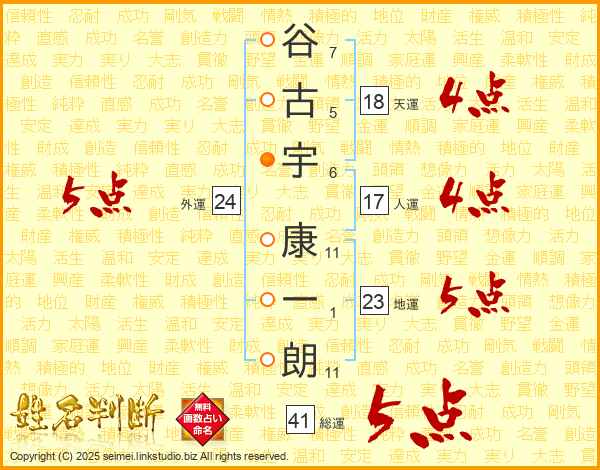 谷(7画)古(5画)宇(6画) 康(11画)一(1画)朗(11画)
