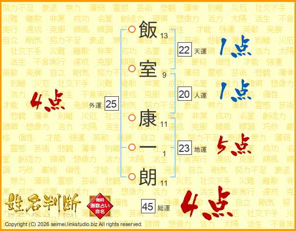 飯(13画)室(9画) 康(11画)一(1画)朗(11画)