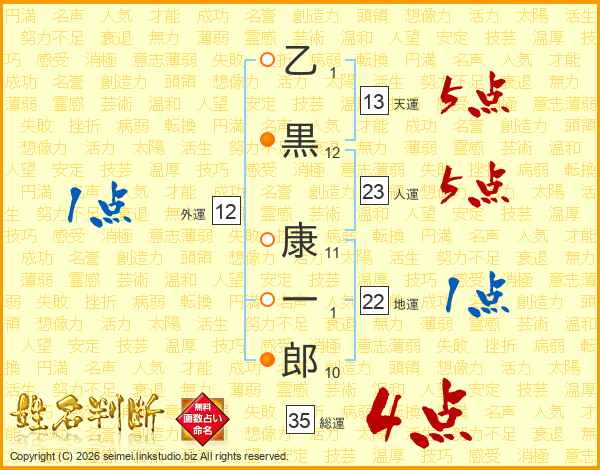 乙(1画)黒(12画) 康(11画)一(1画)郎(10画)
