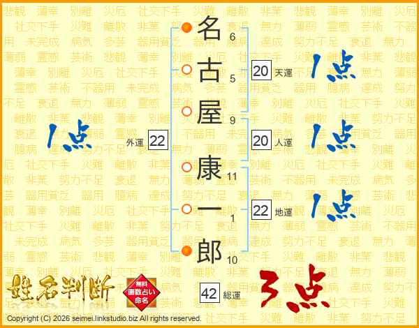 名(6画)古(5画)屋(9画) 康(11画)一(1画)郎(10画)