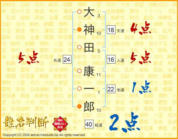 大(3画)神(10画)田(5画) 康(11画)一(1画)郎(10画)