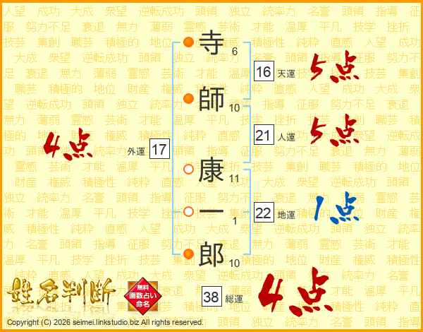 寺(6画)師(10画) 康(11画)一(1画)郎(10画)