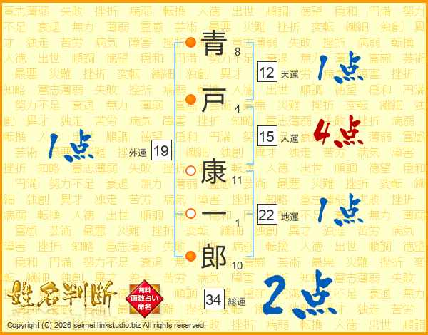 青(8画)戸(4画) 康(11画)一(1画)郎(10画)