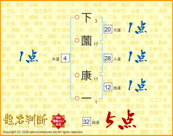 生活面を象徴する運勢です。外部から受ける影響力を表し、結婚運、家庭運や職場、環境への順応性を表します。総運から人運を引いた画数。姓や名が1文字の場合を除く。