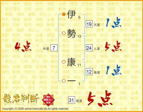 生活面を象徴する運勢です。外部から受ける影響力を表し、結婚運、家庭運や職場、環境への順応性を表します。総運から人運を引いた画数。姓や名が1文字の場合を除く。