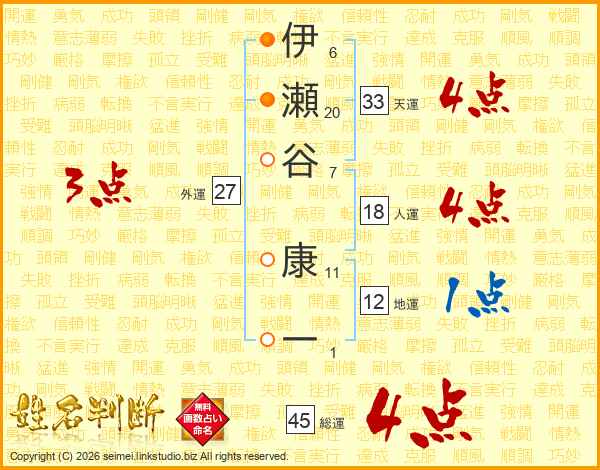 伊(6画)瀬(20画)谷(7画) 康(11画)一(1画)
