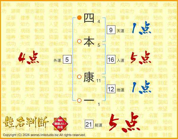 四本康一さんの総運は21画の5点!