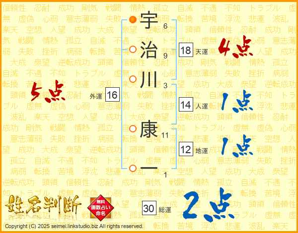 宇(6画)治(9画)川(3画) 康(11画)一(1画)