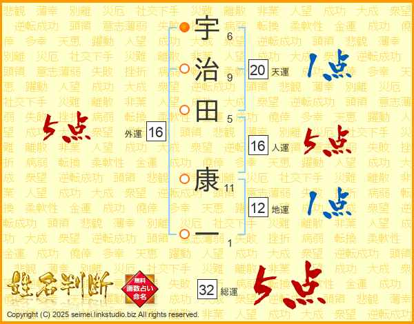 宇(6画)治(9画)田(5画) 康(11画)一(1画)