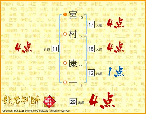 宮村康一さんの総運は29画の4点!