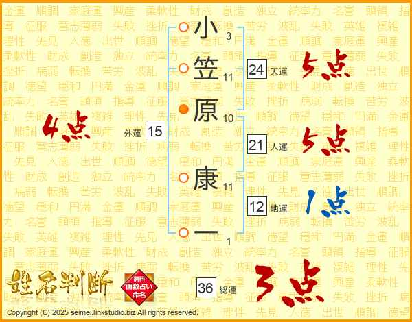 小(3画)笠(11画)原(10画) 康(11画)一(1画)