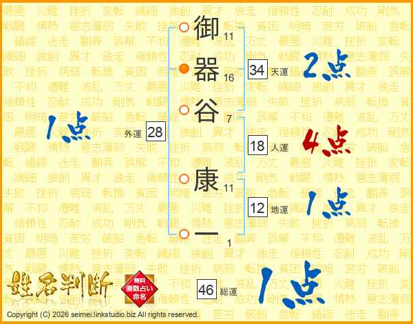 御(11画)器(16画)谷(7画) 康(11画)一(1画)