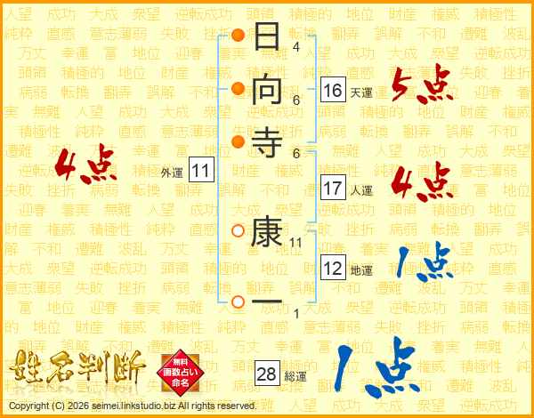 日(4画)向(6画)寺(6画) 康(11画)一(1画)