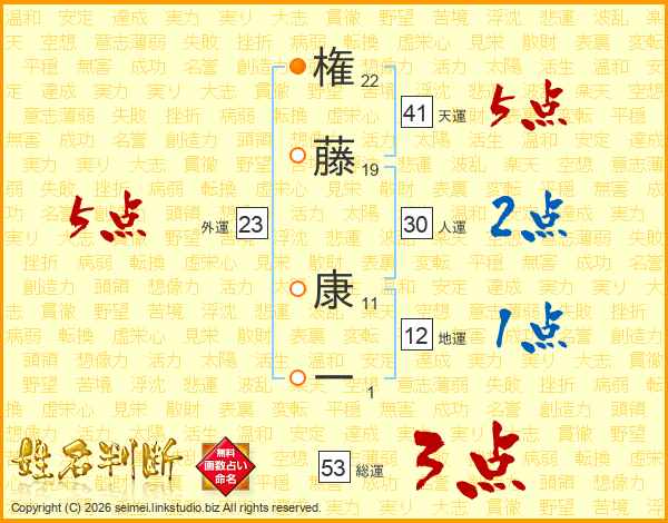 権(22画)藤(19画) 康(11画)一(1画)