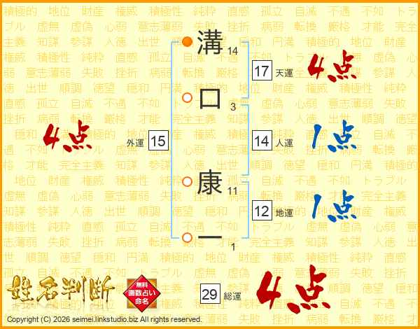 生活面を象徴する運勢です。外部から受ける影響力を表し、結婚運、家庭運や職場、環境への順応性を表します。総運から人運を引いた画数。姓や名が1文字の場合を除く。