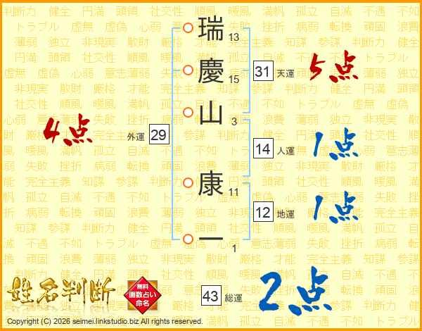 瑞(13画)慶(15画)山(3画) 康(11画)一(1画)