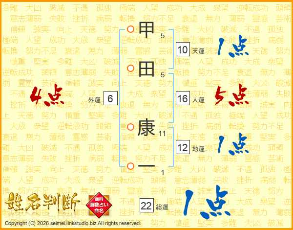 生活面を象徴する運勢です。外部から受ける影響力を表し、結婚運、家庭運や職場、環境への順応性を表します。総運から人運を引いた画数。姓や名が1文字の場合を除く。