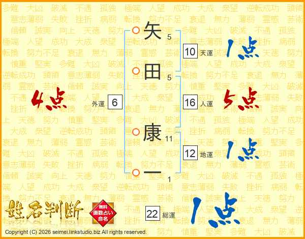 矢田康一さんの総運は22画の1点!
