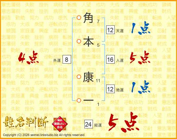 角本康一さんの総運は24画の5点!