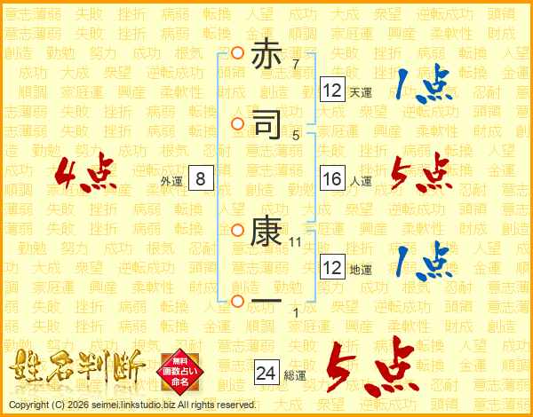 あなたの人生を表す1番重要な運勢です。生涯を通じて影響する総合運となり、主に50歳以降の晩年期に影響を及ぼします。苗字と名前の合計画数。