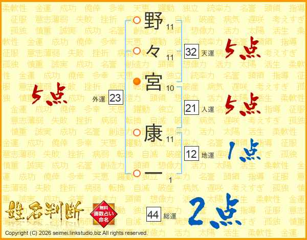 野(11画)々(11画)宮(10画) 康(11画)一(1画)