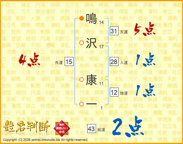 鳴(14画)沢(17画) 康(11画)一(1画)