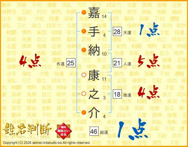 嘉(14画)手(4画)納(10画) 康(11画)之(3画)介(4画)